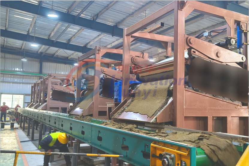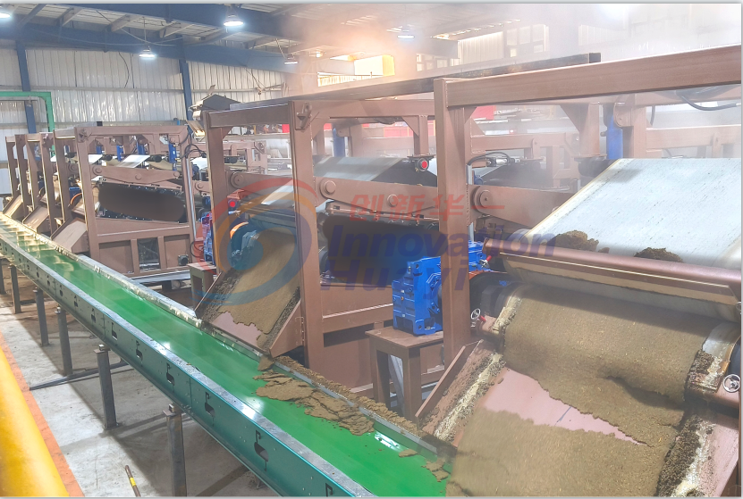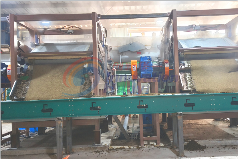 五臺(tái)全新高壓帶式壓榨過(guò)濾機(jī)正轟鳴運(yùn)轉(zhuǎn)。牛糞經(jīng)過(guò)均勻布料裝置鋪在濾帶上,隨著設(shè)備運(yùn)行,糞水被迅速擠壓分離,排出的濾餅含水率穩(wěn)定在50%以下,同時(shí)完整保留了牛糞中的粗纖維結(jié)構(gòu)。